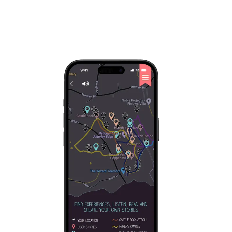 Aiding trekkers with a map and routes, the application helps guide users through Alderley Edge while highlighting points of interest, including AR hotspots, and soundscapes. Each geolocation shows a glimpse into the fantastical history of Alderley Edge, providing inspirational stories and fantasies through AR.